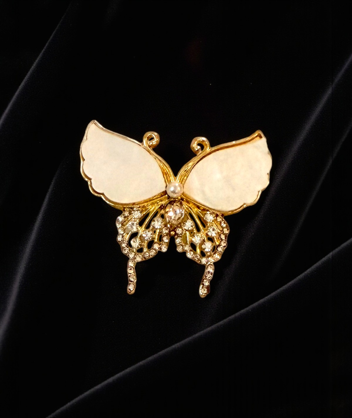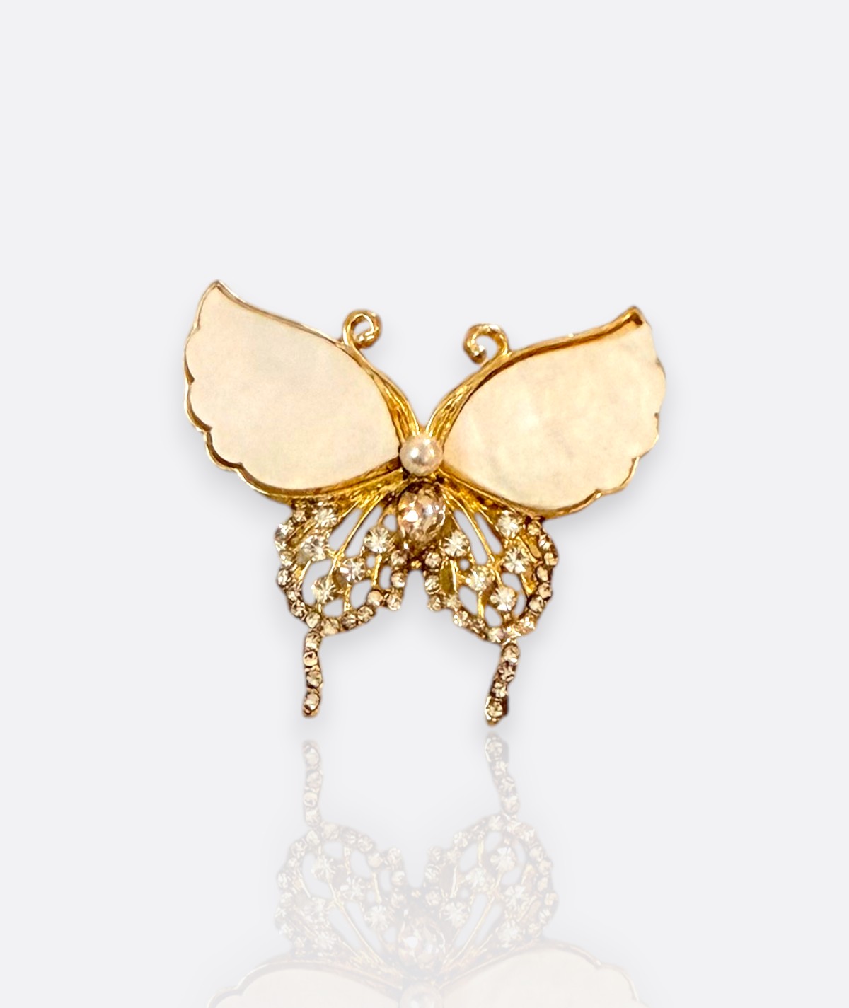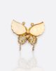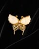 Altın tonlarındaki metal üzerine sedef efektli kanatlarla tasarlanmış bu kelebek broş, alt kısmındaki inci ve taş detaylarıyla zarif bir ışıltı sunar.