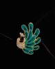 Altın tonlarında metal üzerine zümrüt yeşili mine tüylerle tasarlanmış bu tavus kuşu broş, zarafeti ve ışıltıyı bir araya getiriyor.